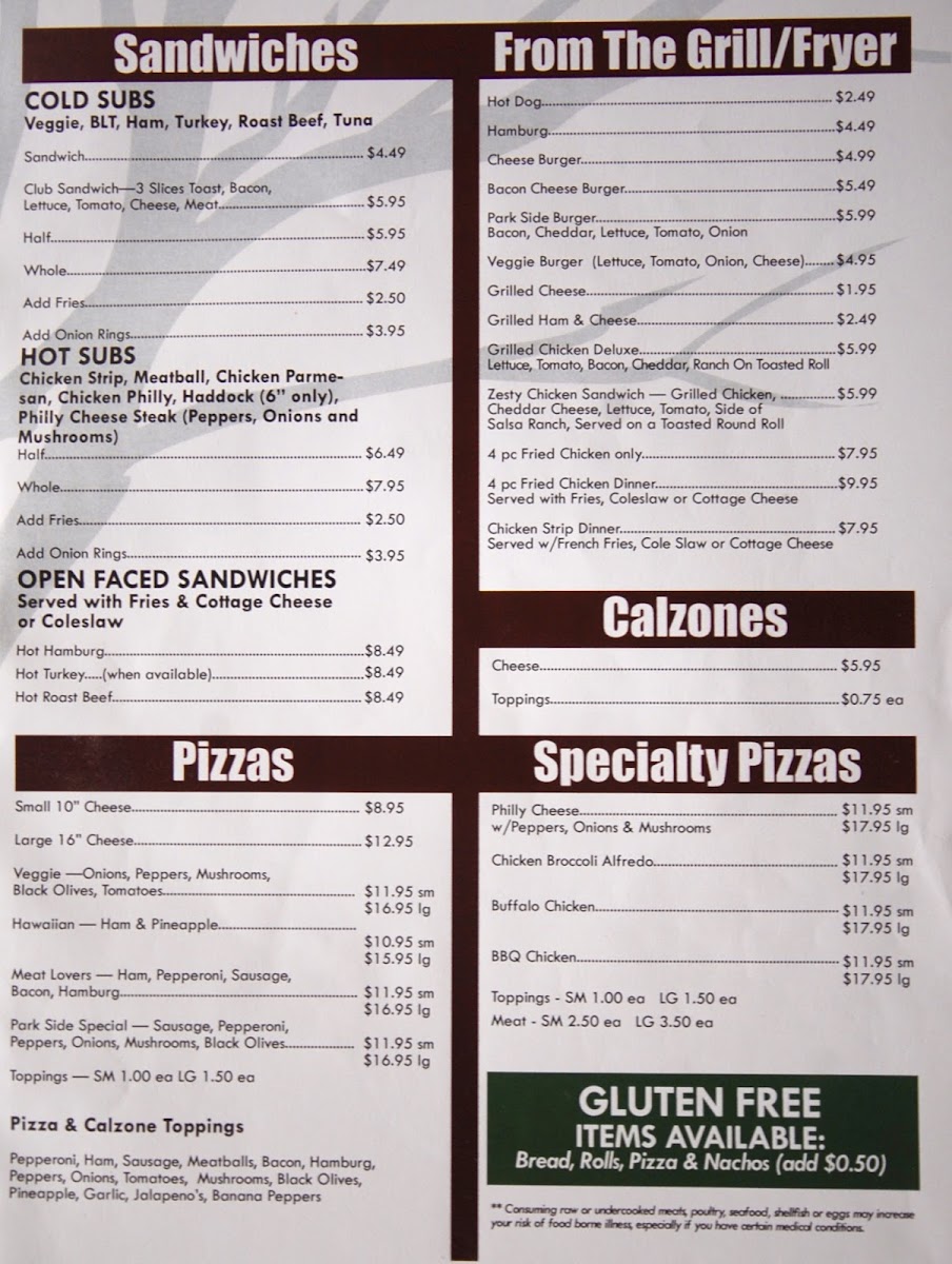 Parkside Grill offers a diverse and satisfying menu that caters to a variety of tastes. One standout is the Buffalo Chicken Pizza, which combines the spicy kick of buffalo sauce with tender chicken and a perfect blend of cheeses. Another fan favorite is the Meat Pizza, a hearty option loaded with multiple types of meat, ensuring a fulfilling meal for carnivores. For those looking for something a bit more traditional, the Calzone is a deliciously crispy, oven-baked treat filled with savory ingredients, offering a satisfying alternative to pizza. Whether you're in the mood for something bold or classic, Parkside Grill’s menu delivers flavorful choices that are sure to please any diner.